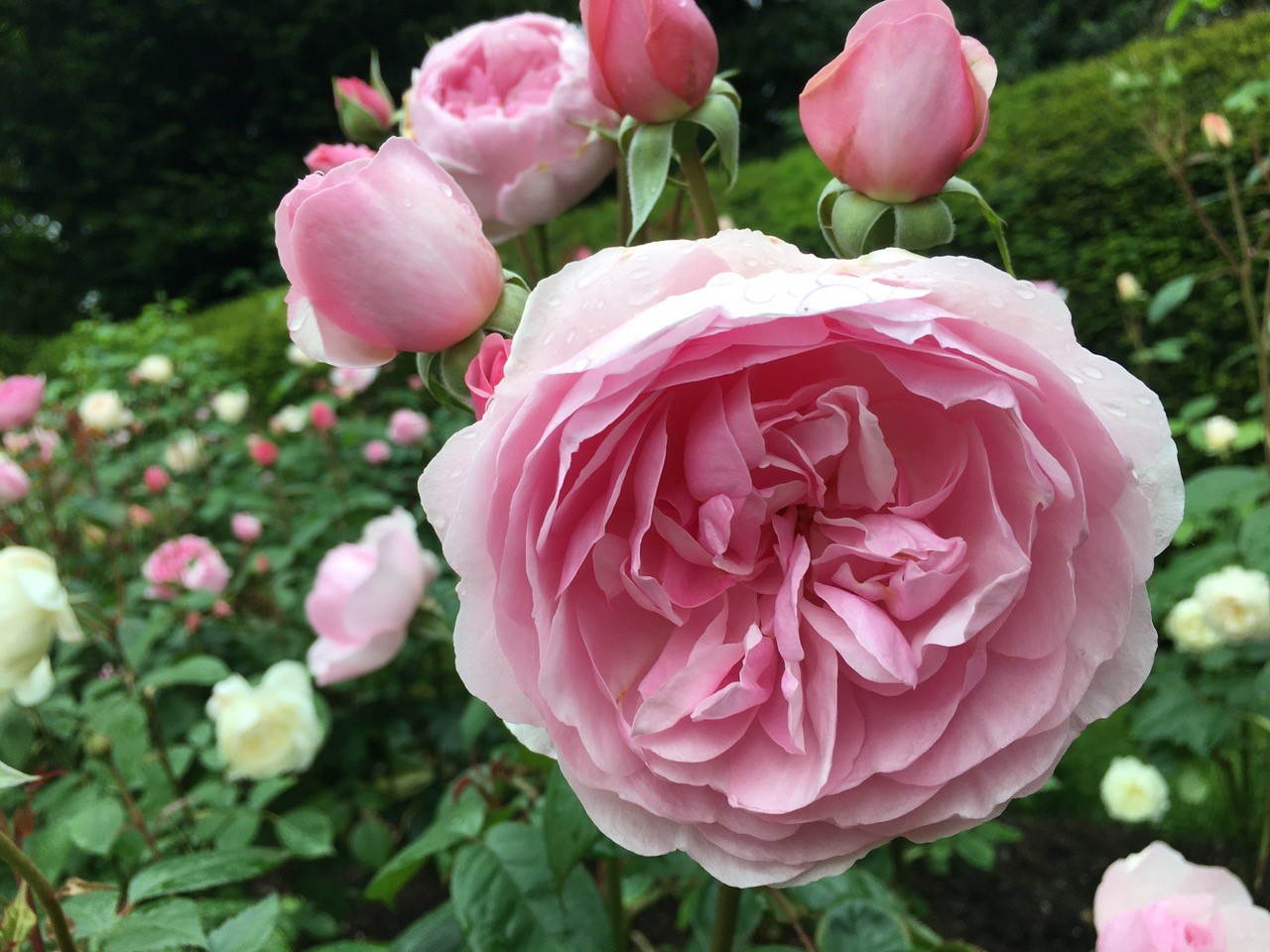 From here, visitors can wander up the drive to the walled gardens, walk into the Cut Flower Garden, and find our newly planted roses nestled against deep green yew hedging. Highlights include the glowing orange of Lady of Shallot, the soft pale pink and apricot tones of Elizabeth, the deep pink shades of Young Lycidas, and the exquisite mid-pink blooms of Olivia Rose Austin and Jacques Cartier.